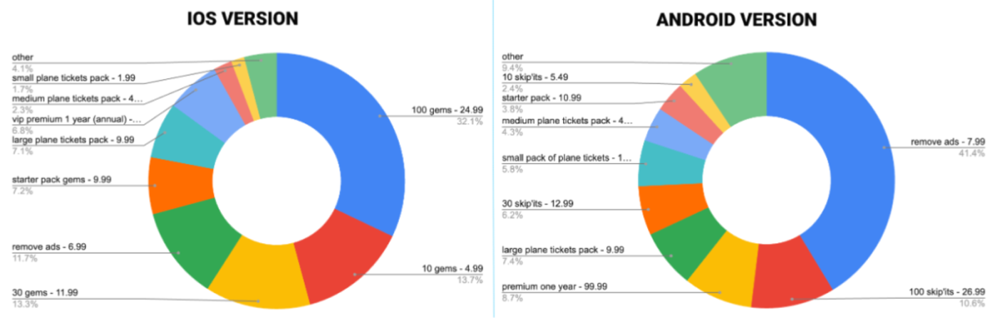 进一步看收入构成:iOS 端以硬通货礼包 (火箭升级用宝石) 为主,大额机票包贡献 7.1%,新版高价 「去广告」IAP 占 11.7%。