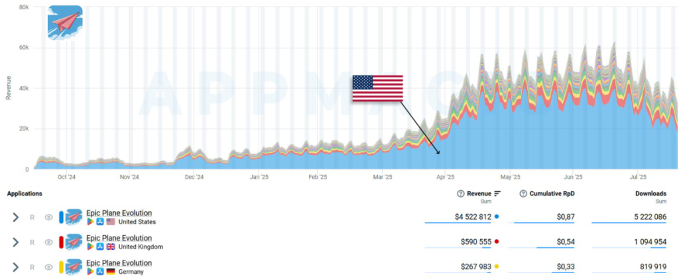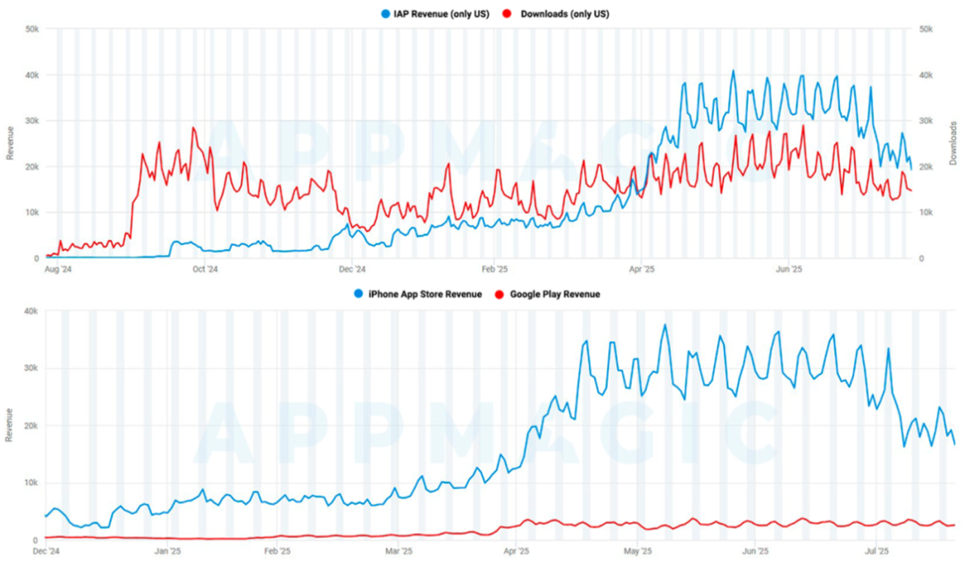 事实上,这款游戏长期徘徊在日均 IAP 收入 1~1.2 万美元的水平。但 2025 年 4 月起情况骤变:流水明显攀升,并主要由美国市场驱动。