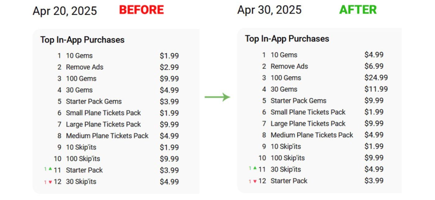 这种渐进式投放避免了高价选项吓跑新用户,也提高了转化率。通过这三步,游戏从广告驱动转向 IAP 驱动,完成了关键进化。