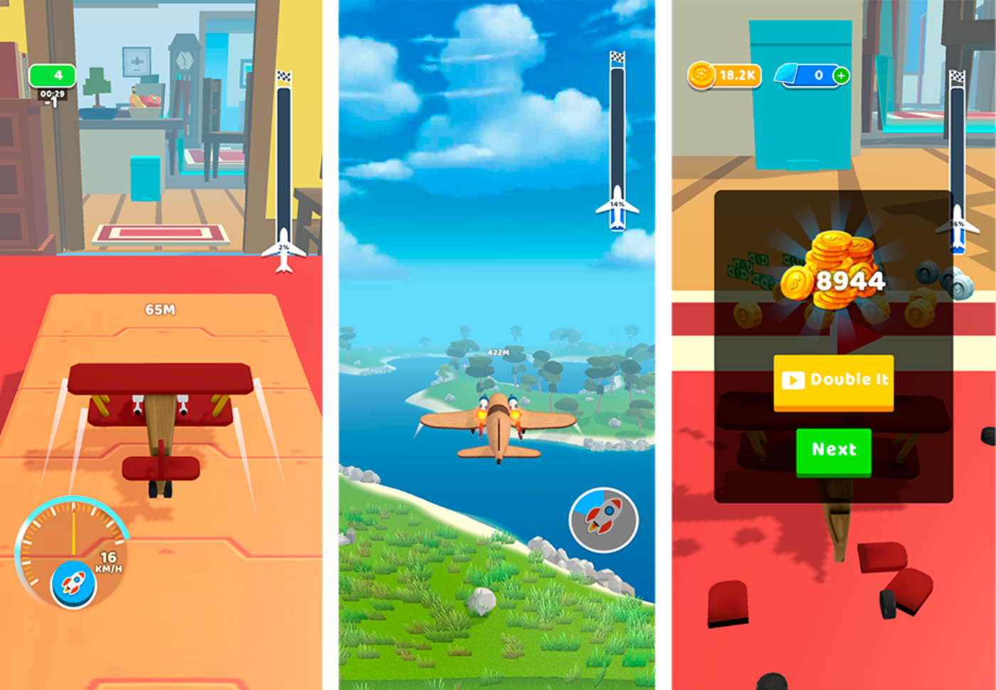 完成飞行后,玩家会获得金币,用于升级飞机,还有弹弓和金币倍增道具。由此形成 「飞行—赚钱—升级」 的循环。为避免单调,游戏还提供新飞机、新场景和新障碍。