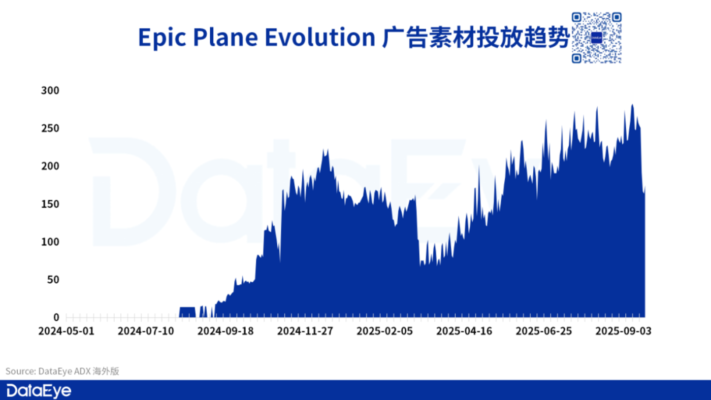 DataEye-ADX 海外版数据显示,《Epic Plane Evolution》 去年在上线后便开始进行广告素材投放,在今年 3 月份开始投放量明显下滑,大概率是配合游戏进行设计上的改动。进入 4 月份后投放量再度上升,目前最高时单日投放素材超过 250 组,整体走势稳定。