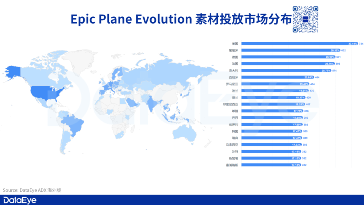 DataEye-ADX 海外版数据显示,《Epic Plane Evolution》 近 180 天主要的投放市场集中在欧美地区,其中美国市场占 33.41% 排在第一。除欧美外,在巴西和东南亚市场也有少量投放。