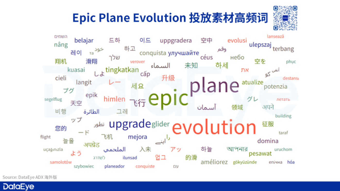 DataEye-ADX 海外版数据显示,《Epic Plane Evolution》 近 180 天投放热门文案中素材语言以英文为主,Top 高频词除了游戏名外,大部分素材文案都围绕着强调升级玩法的 「upgrade」 展开。