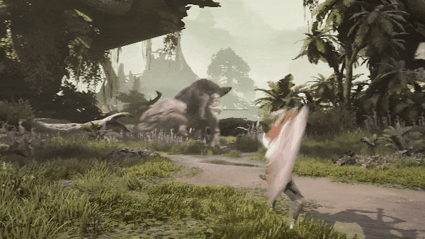 此外,开发团队还提到了非常重要的两点。其一,玩家可以使用建造功能移动到高处或者更远的地方,协助整个大世界的探索,比如 PV 中出现的鼓风台、弹射器以及滑索,很多都是可以主动建造,结合出现的砍树镜头,甚至可以合理猜测游戏中可能会加入一些 SOC 游戏的建造玩法,那么无论是在狩猎的战斗中或者玩家的社交上,都可能出现一些意想不到的应用。