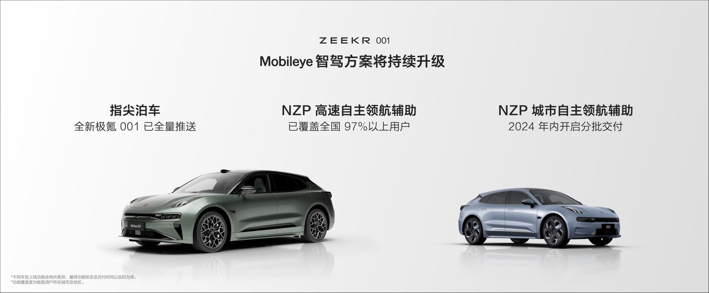 高速 NZP 方面,「浩瀚智驾 2.0」 将实现交付即开通,将覆盖全国高速和高架道路。此外,极氪 001 采用的 Mobileye 智驾方案,也在持续升级。目前指尖泊车功能在全新极氪 001 上已经完成了全量推送;高速 NZP 的开通城市,也已覆盖 97% 以上极氪用户所在的地区。