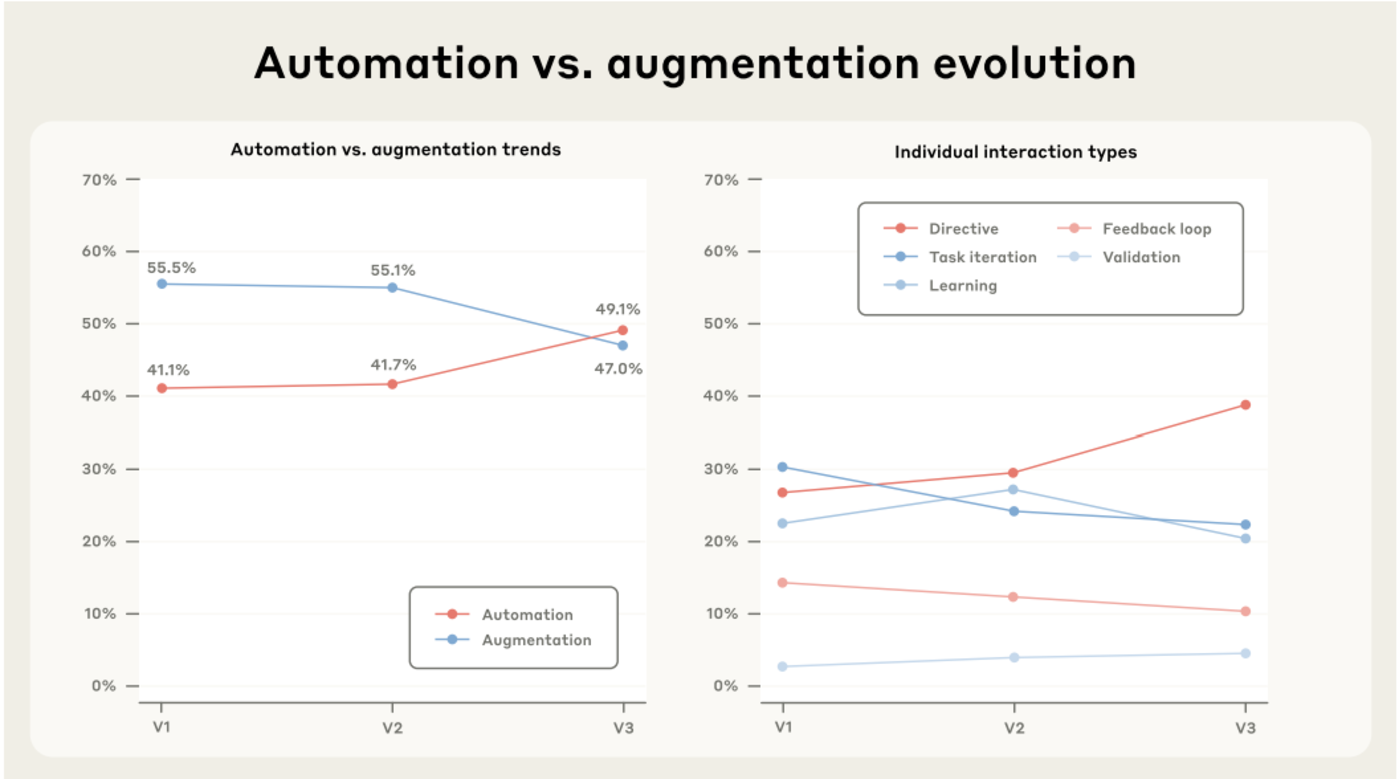 上面的统计简单说就是人们交给大模型的任务越来越高级,在向脱手的方向移动,并且第一次超过了把大模型当纯粹的工具。