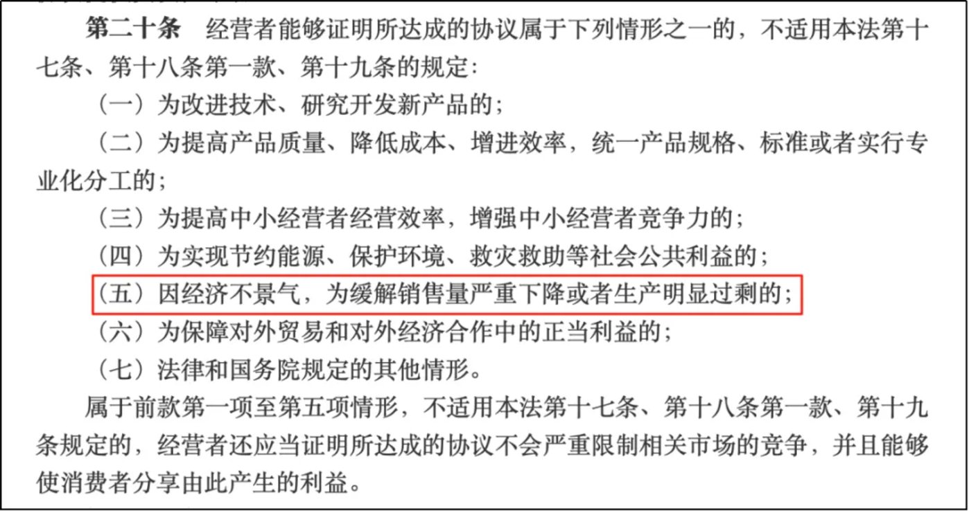 实际上,《反垄断法》 第二十条第五项明确规定 「因经济不景气,为缓解销售量严重下降或者生产明显过剩的」,不属于该法禁止的垄断协议。