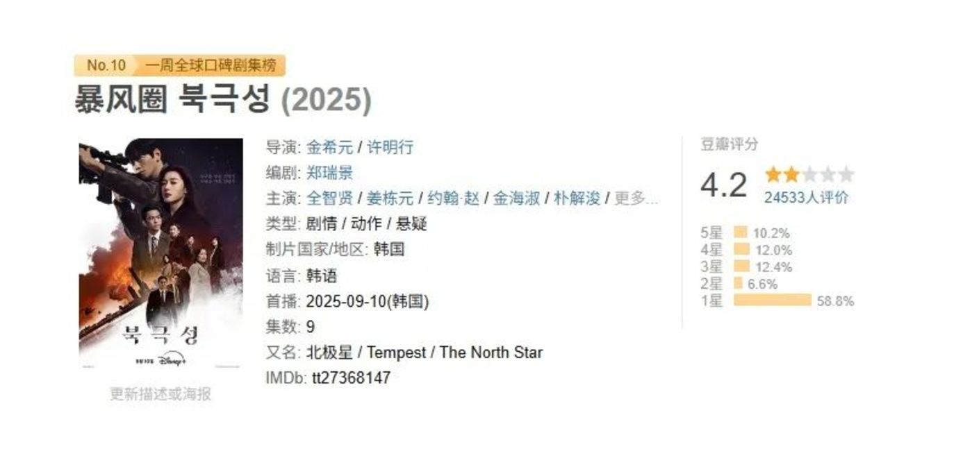 在舆论与商业的双重反噬下,《暴风圈》 本身的口碑也彻底崩盘。其豆瓣评分从开分时的 7.1 一路暴跌至 4.2,超过 60% 的观众打出一星评价。这部集结了顶级资源的 「野心之作」,在中国市场遭遇了全面溃败。