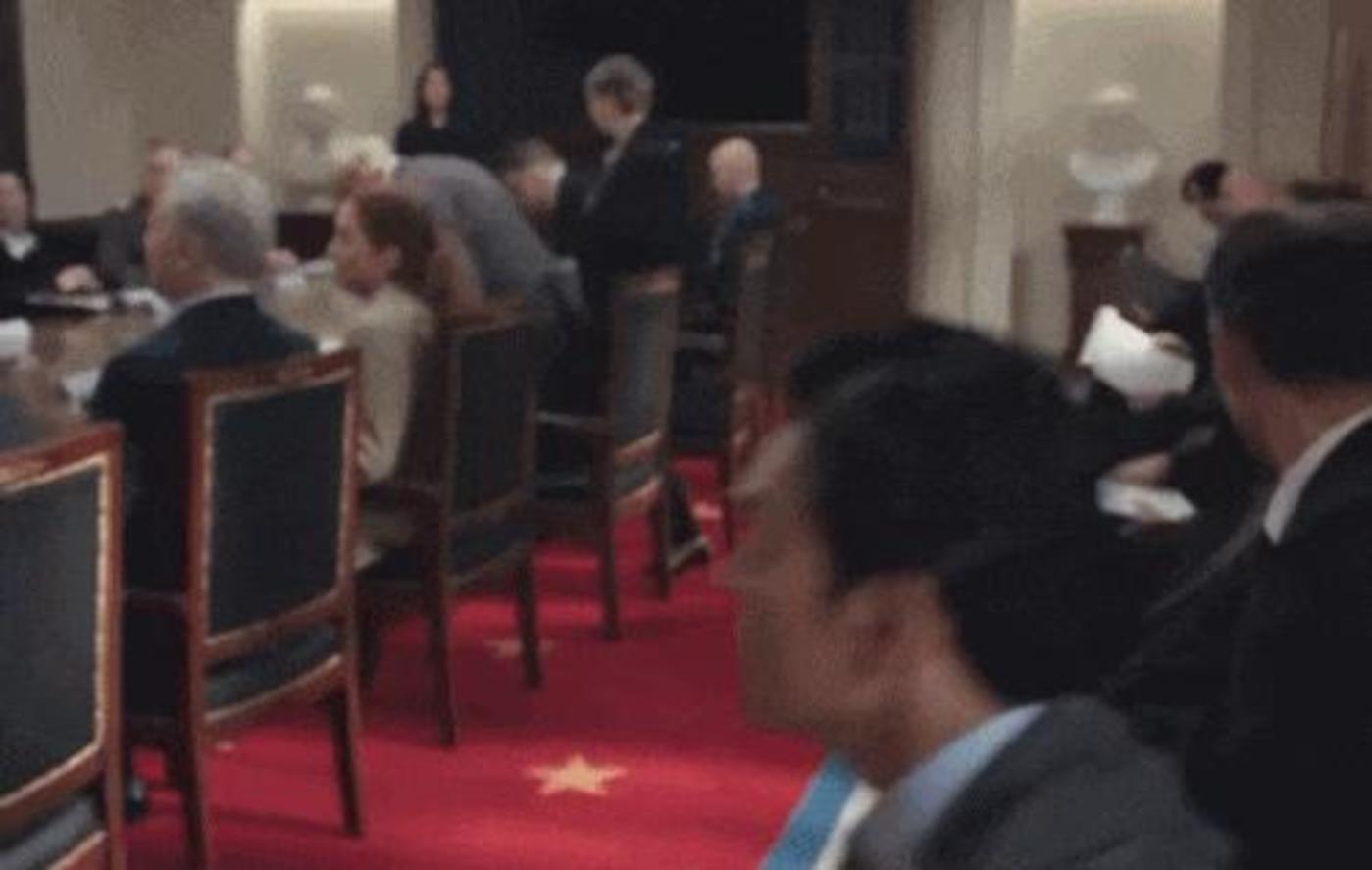 虽然制作经费有 700 亿韩元,但剧组显然容不下一个中文老师。剧中不仅莫名出现了全智贤用 「塑料中文」 背诵李白 《将进酒》 的桥段,反派角色更是频繁使用蹩脚中文对话。更令人愤慨的是,剧中还出现了带有黄色五角星图案的红地毯,演员坐在上面开会的场景被观众解读为蓄意践踏国旗的象征,其丑化中国文化,强化 「中国即反派」 的意图不言自明。