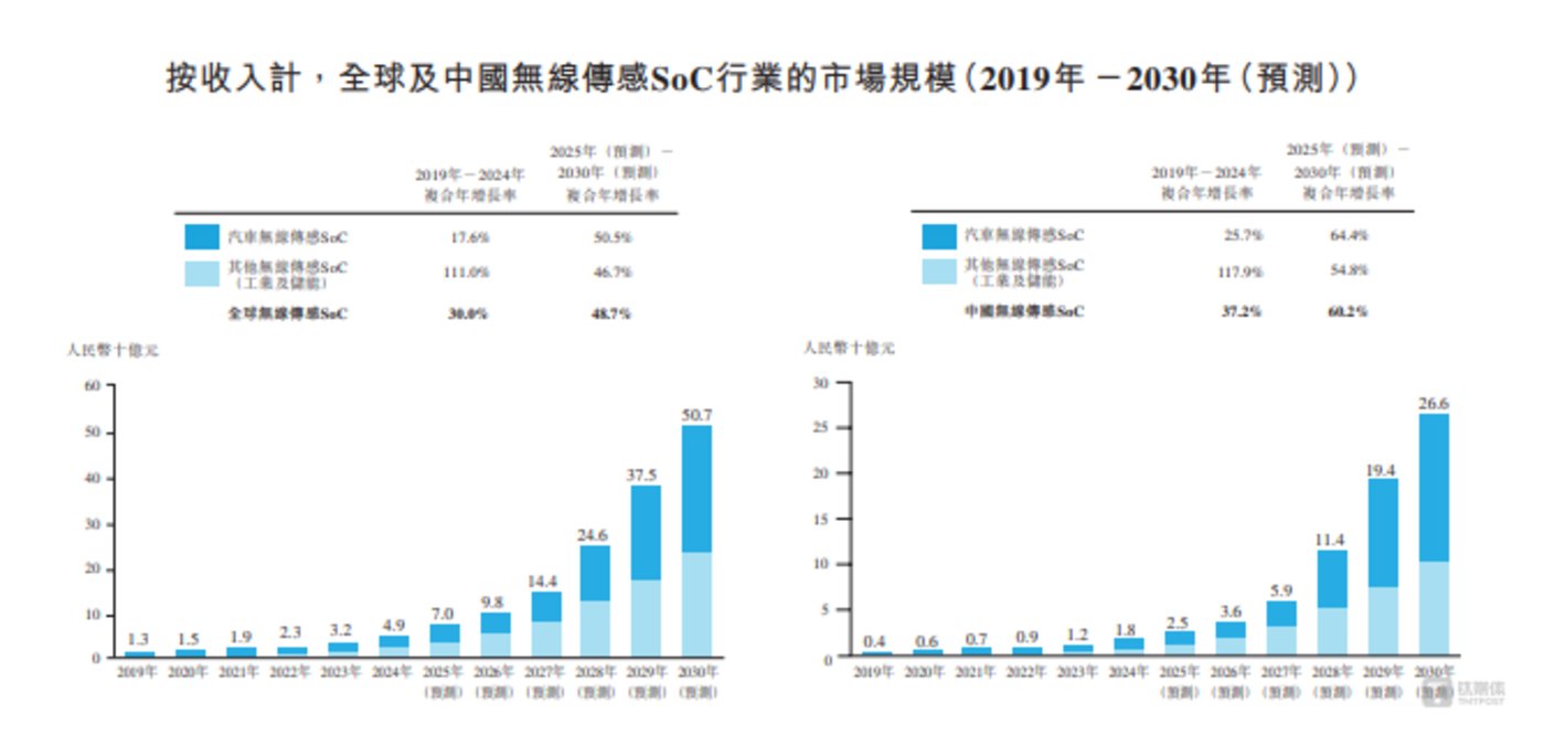 根据弗若斯特沙利文报告,2019 年-2024 年全球无线传感 SoC 行业的市场规模正在以 30% 的增速增长,同时该报告预计全球无线传感 SoC 行业的市场规模将由 2025 年的人民币 70 亿元增长至 2030 年的人民币 507 亿元,复合年增长率为 48.7%。预计中国无线传感 SoC 的市场规模将由 2025 年的人民币 25 亿元增长至 2030 年的人民币 266 亿元,复合年增长率为 60.2%。