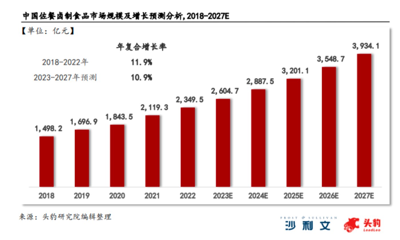 据沙利文和头豹的研究报告,中国佐餐卤制食品市场规模整体以较快速度增长,市场规模由 2018 年的 1498.2 亿元增长至 2022 年的 2349.5 亿元,年复合增长率达 11.9%。预计 2023-2027 年,中国佐餐卤制食品市场规模仍将以较高速度增长,2027 年市场规模将达到 3934.1 亿元,年复合增长率达 10.9%。