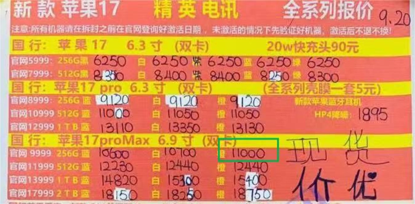 iPhone17 上线后,我们走访华强北多个档口发现,截至目前,相关机型仍需要加价购买,iPhone 17 与 iPhone 17 Pro 系列较官网价格高出 400—600 元不等,iPhone 17 Pro Max 则高出 500—1400 元不等。