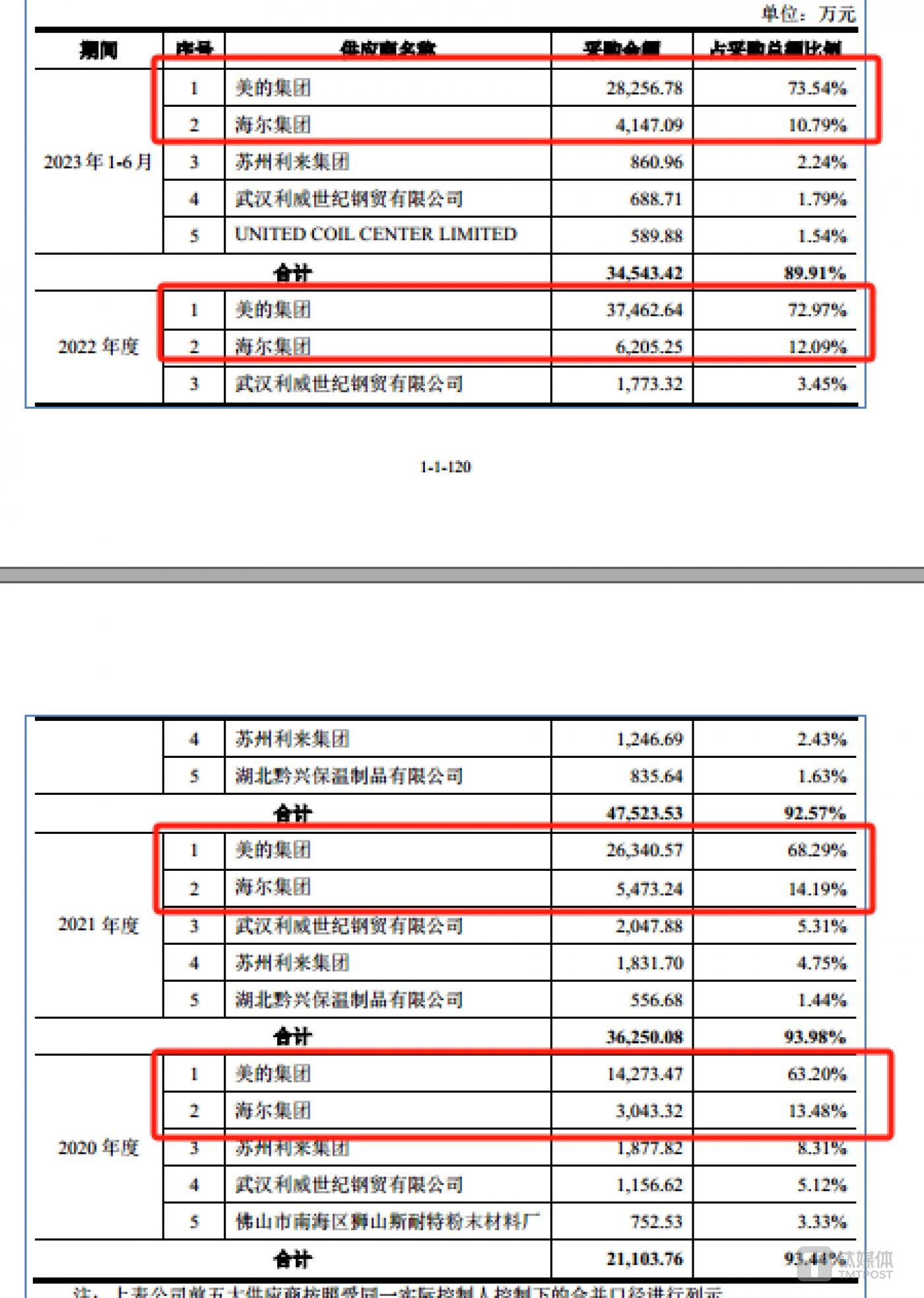 需要指出的是,美的集团、海尔集团除了长期霸占着宏海科技的前两大客户头衔之外,其还同时霸占着宏海科技的前两大供应商。报告期内,宏海科技向美的集团采购的金额分别为 14273.47 万元、26340.57 万元、37462.64 万元、28256.78 万元,分别占当期采购总额的 63.2%、68.29%、72.97%、73.54%;向海尔集团采购的金额分别为 3034.32 万元、5473.25 万元、6205.25 万元、4147.09 万元,分别占当期采购总额的 13.48%、14.19%、12.09%、10.79%。也就是说,宏海科技每年向美的集团和海尔集团至少采购 7 成的原材料。