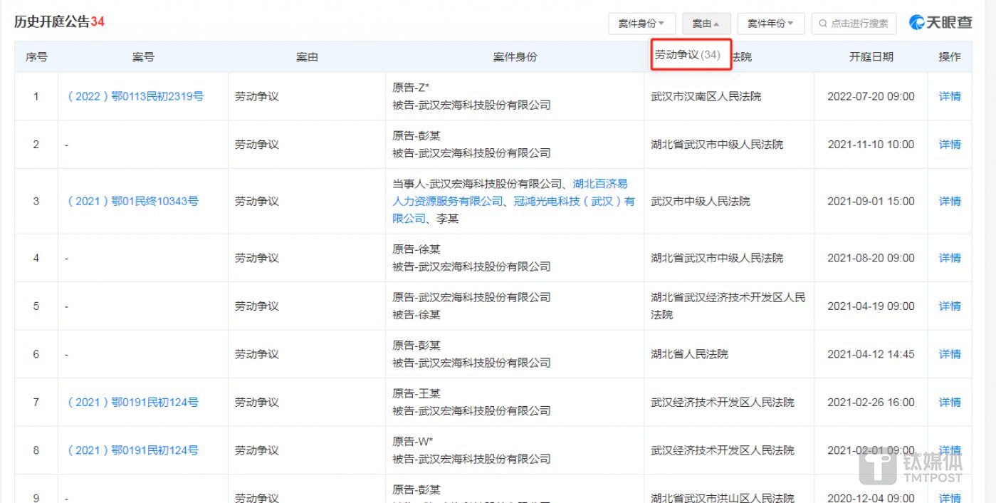 另外,钛媒体 APP 注意到,宏海科技还与员工存在不少的劳务纠纷。天眼查显示,宏海科技曾 34 次因与员工的劳务争议而对簿公堂。