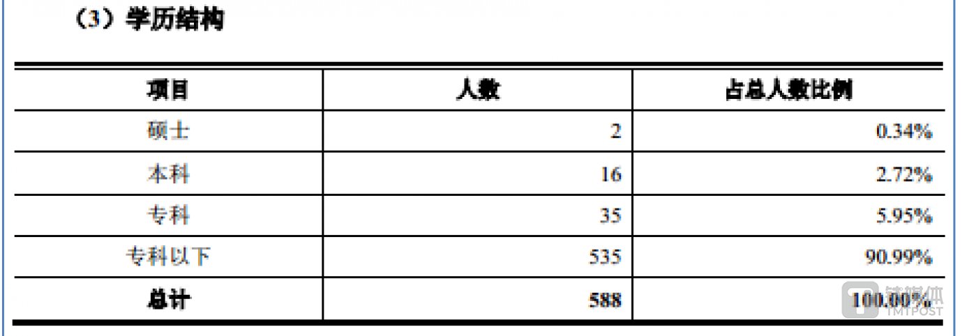 从员工组成机构上来看,截至 2023 年 6 月末,宏海科技拥有 588 名员工,其中学历在本科及以上共 18 人,专科及以下的 570 人,这也意味着,96.94% 的员工学历在专科及以下。