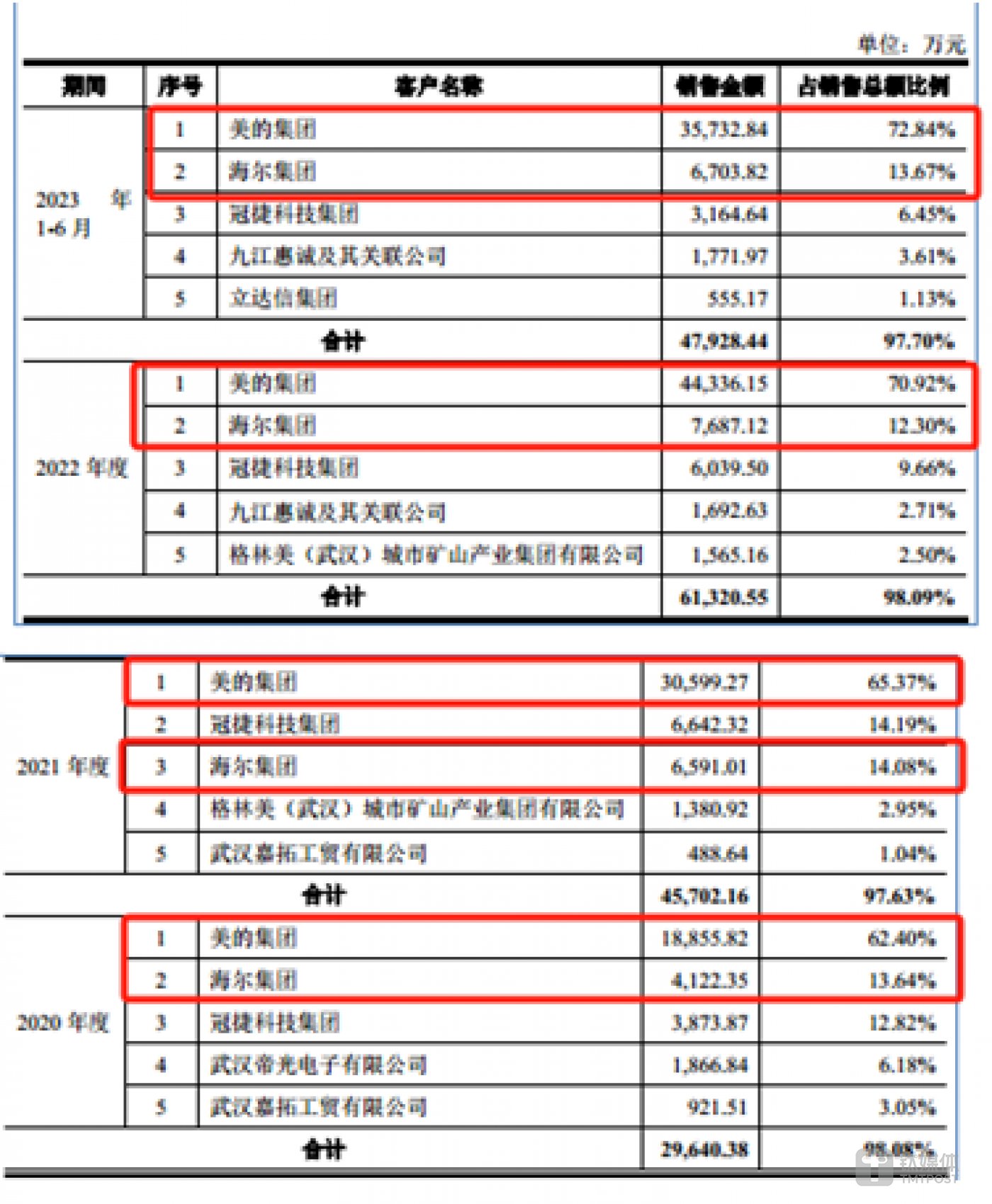 其中向美的集团产生的销售收入分别为 18855.82 万元、30599.27 万元、44336.27 万元,分别占当期营业收入的 62.4%、65.37%、70.92%、72.84%;向海尔集团产生的销售收入分别为 4122.35 万元、6591.01 万元、7687.12 万元、6703.82 万元,分别占当期营业收入的 13.64%、14.08%、12.3%、13.67%。也就是说,美的集团和海尔集团两家公司每年至少给宏海科技贡献超过 7 成的收入。
