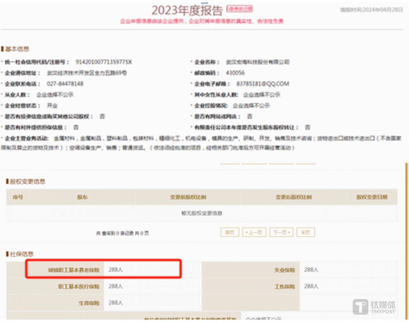 令人不解的是,国家企业信用信息公示系统显示,2023 年宏海科技共有 288 人缴纳了社保。这就不禁令人疑惑,2023 年下半年,宏海科技是有大量员工离职?还是宏海科技存在未给员工缴纳社保的情形?