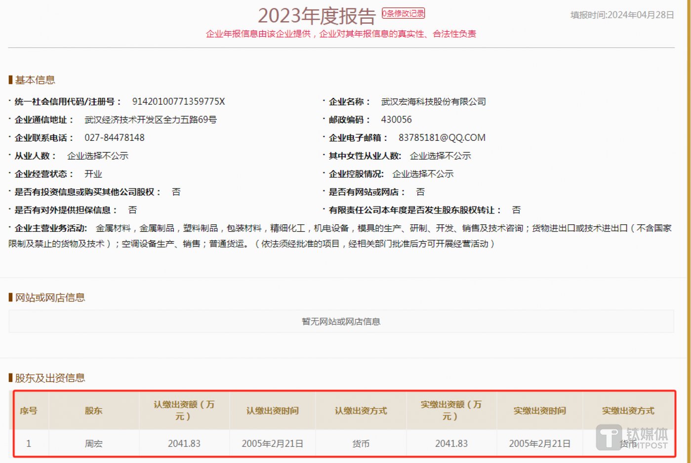 然而,国家企业信用信息公示系统显示,2023 年,宏海科技仅有周宏一名股东,并且通过认缴和实缴出资额均为 2041.83 万元。