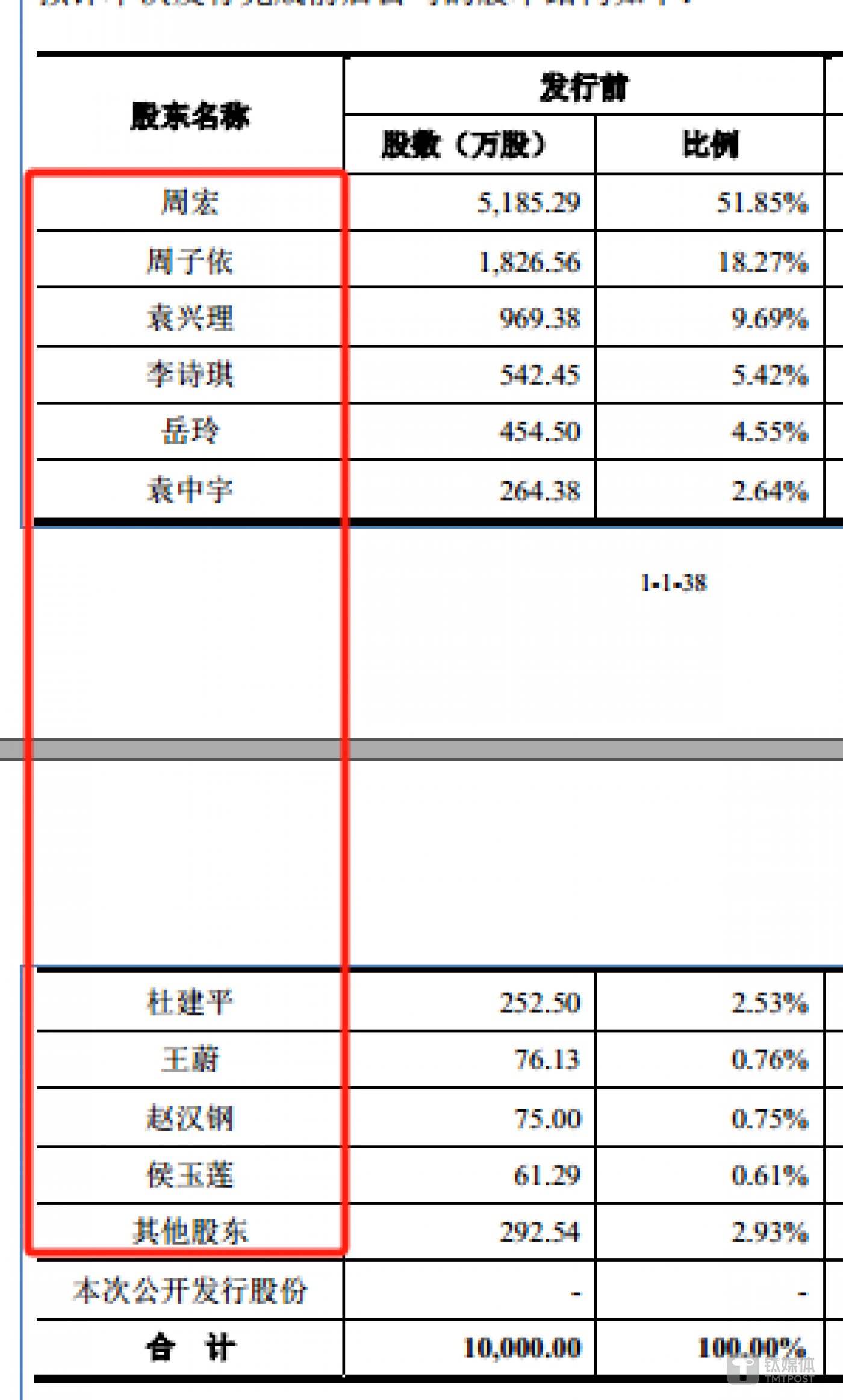 除了员工情况外,宏海科技的股东情况也令人费解。招股说明书显示,在此次 IPO 股票发行前,周宏、周子依、袁兴理、李诗琪、岳玲等均是公司股东,总股本为 1 亿股,具体情况如下: