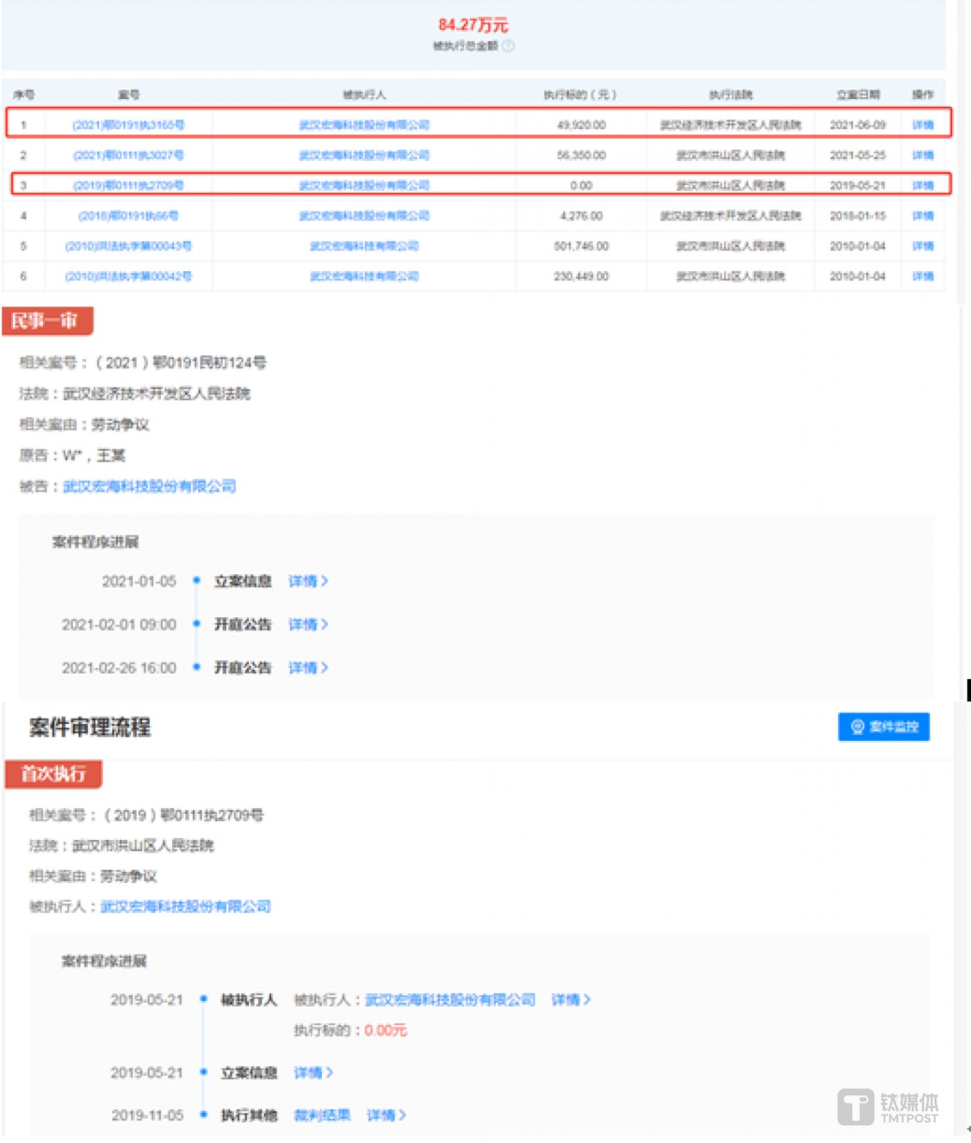 特别是 2021 年和 2019 年,宏海科技先后两次因劳务争议成为了被执行人。