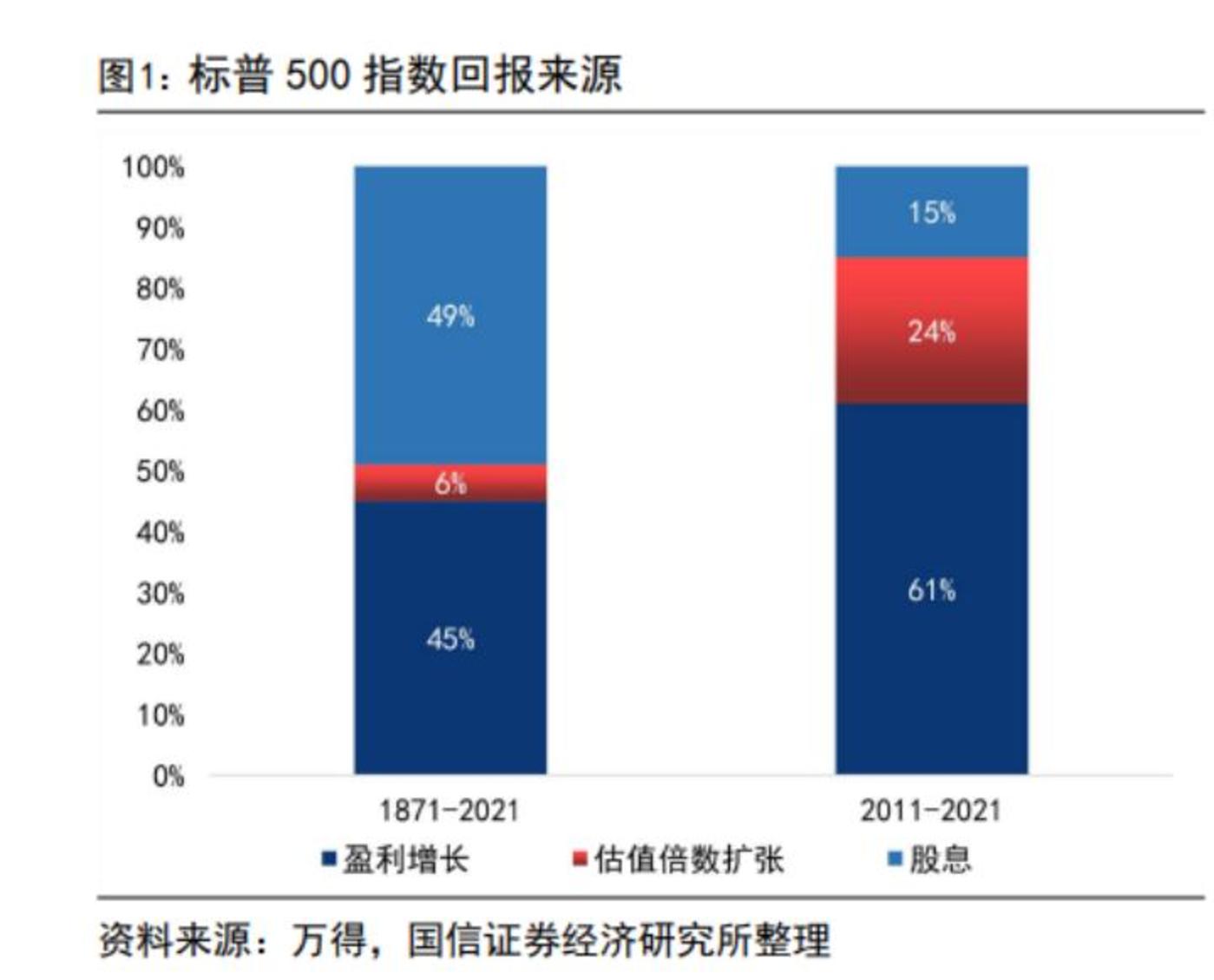 从美国股市过去 150 年的历史看,标普 500 指数回报中,有 49% 也就是接近一半可以归结为股息,45% 归结为盈利增长,估值倍数扩张只有 6%。 最近 10 年股息的贡献占比降到 15%,看似在缩水,实际可能比重变化不大。