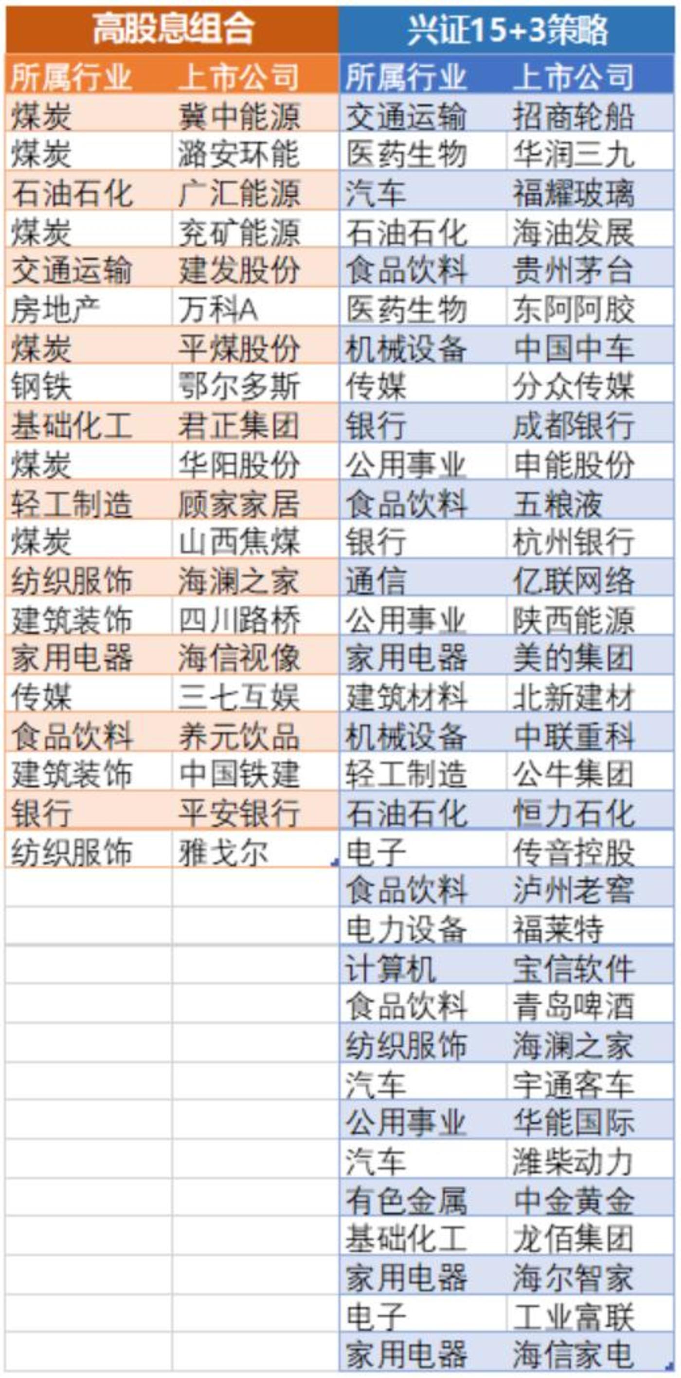 上图是 8 月份高股息策略和兴业证券 15+3 策略的组合持仓,可以供大家参考。