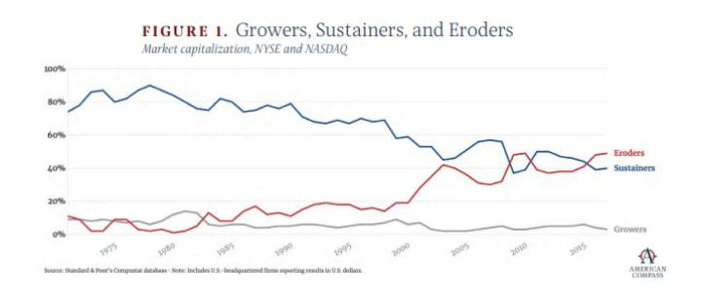 侵蚀型公司 1980 年占比只有 1% 左右,到了 2010 年这个占比已经提升到了 49%。 并且侵蚀型公司已经超过维持型,成为美股的主流。