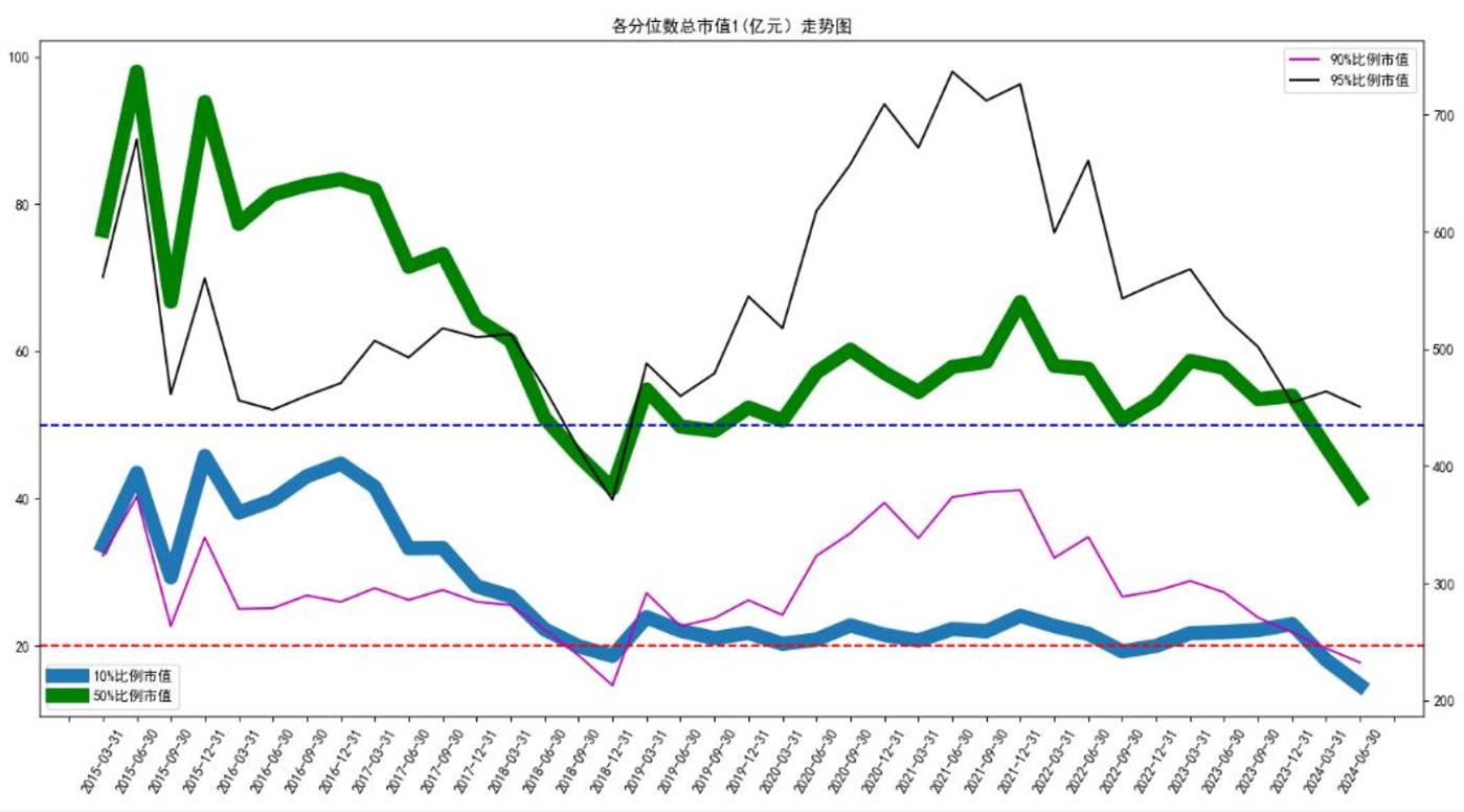 2024 年的问题就是全市场市值普遍下行,10% 分位的股票市值从 20 亿降到 15 亿左右。这个策略下一步是否有效,关键就是看 A 股上市公司保底的壳价值到底有多少。
