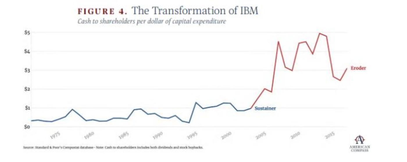 典型的比如蓝色巨人 IBM,1970 年代的时候每 1 美元的资本开支,对应着给股东的回报只有 30 美分。可是进入 2000 年之后,每 1 美元的资本开支背后,就对应着 2 美元以上的股东回报,部分年份甚至接近 5 美元。