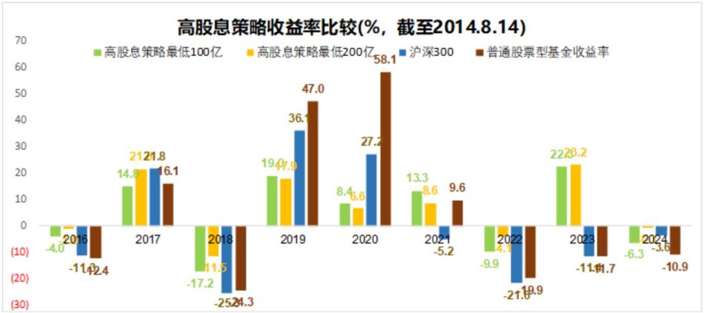 跟小市值策略一样,我们同样可以看到策略有效性的均值回归。2019、2020 两年,高股息策略远远跑输市场平均水平,随后的 4 年,高股息策略就给了市场惊喜。略有不同的是,小市值策略在连续有效了 3 年之后,2024 年崩掉了,但高股息策略截至目前还依然有效。