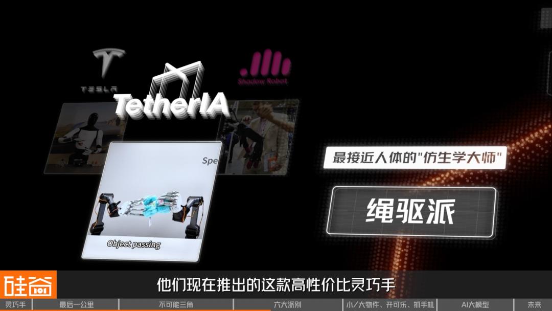 这就像是控制木偶一样—— 所有的线都连到一个中央控制台,通过拉动不同的线来实现复杂的动作。这种设计的优点是轻量化、力量输出稳定、具备一定自适应能力,而且布局和人体更接近。特斯拉最新的 Optimus 手宣称它拥有 22 个自由度,已经非常接近人手的 27 个自由度了。我们实地探访的 TetherIA 他们现在推出的这款高性价比灵巧手也是采用的绳驱方案。