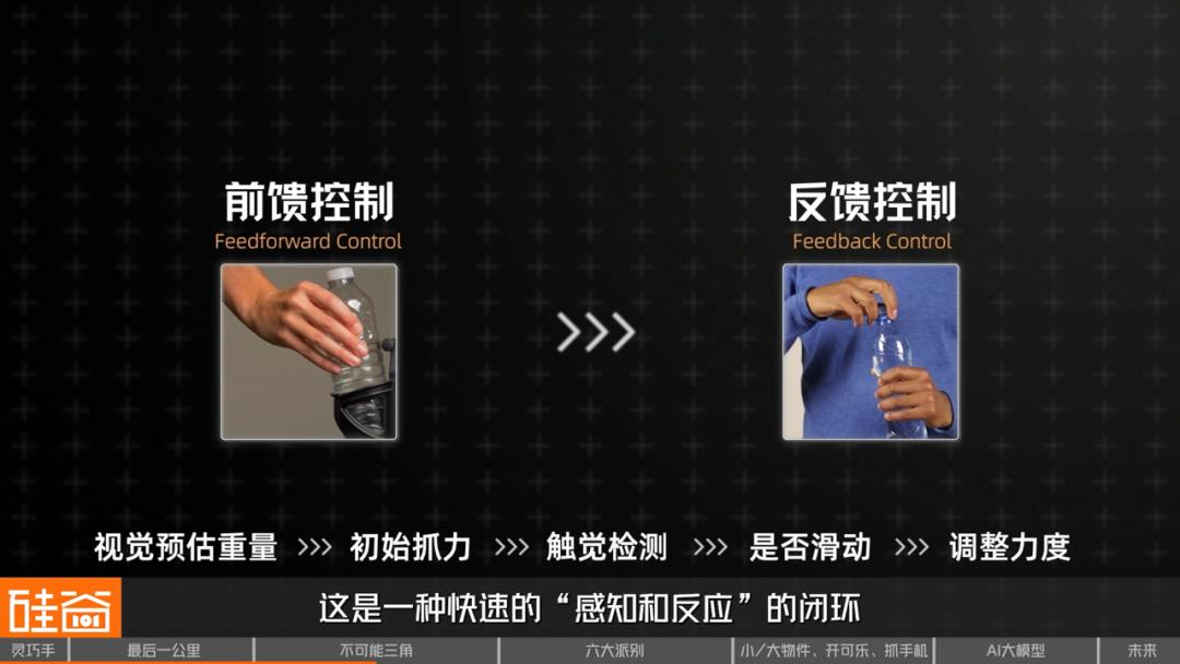 人类抓握力的调整分为两个闭环控制:第一是前馈控制 (Feedforward Control),也就是大脑基于视觉和经验,在抓取前预测所需力量。例如,看见一瓶水时,大脑会预估重量,先设定一个初始抓力。