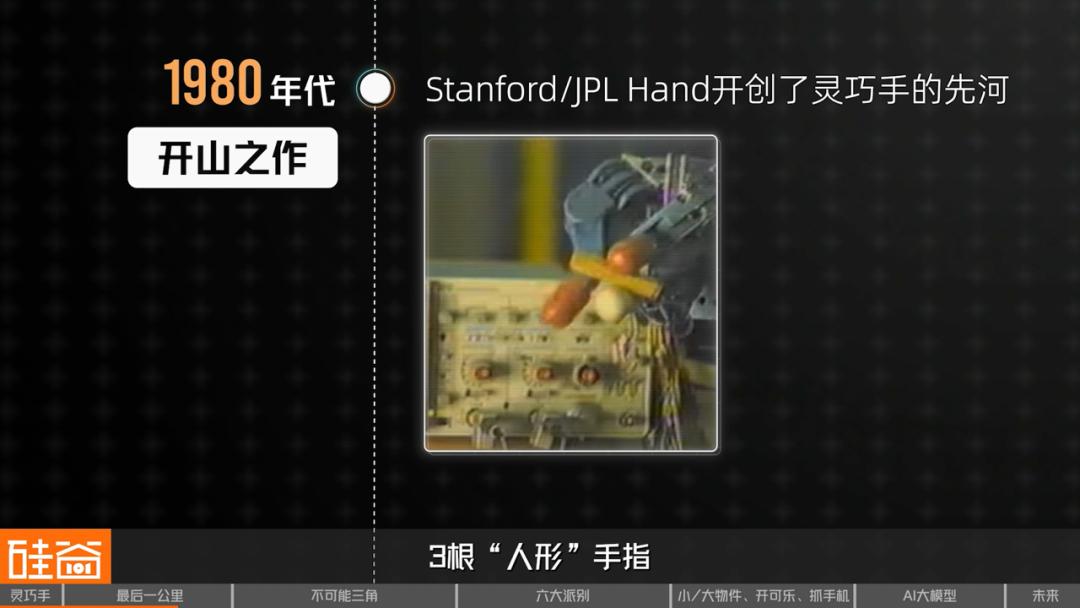 Stanford/JPL Hand 开创了灵巧手的先河,3 根“ 人形” 手指,每根三个关节,配备触觉/力反馈。但它更像是证明“ 这事儿能做” 的概念机。