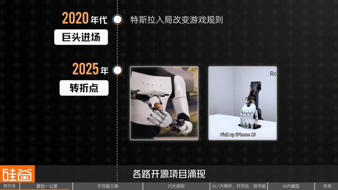 特斯拉 22 个自由度的新手、TetherIA 的 300 美元开源革命、各路开源项目涌现。灵巧手即将迎来“ 智能手机时刻”—— 从极客玩具变成人人可得的工具。