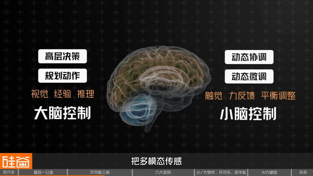 如果灵巧手要完全复制人手的这个反馈闭环,需要的不只是传感器和控制算法的堆叠,而是一个更接近人类神经系统的分层控制架构。可以类比为“ 大脑控制” 和“ 小脑控制”:大脑控制依赖视觉、经验和推理,用于规划动作和做出高层决策;而小脑控制则依靠触觉、力反馈和实时的平衡调整,负责细节上的动态微调与协调。