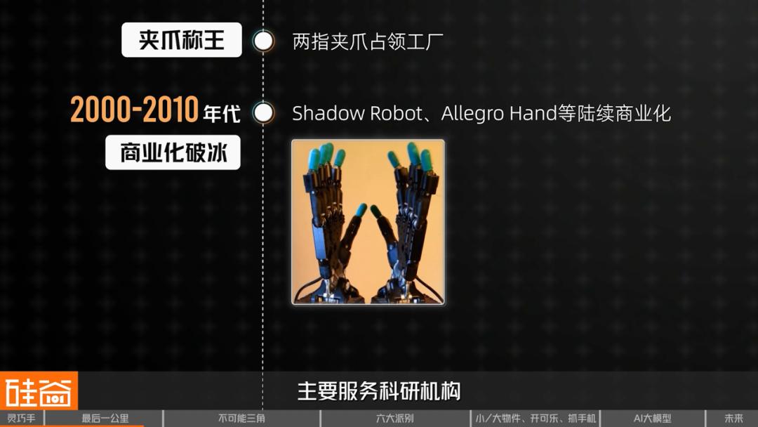 Shadow Robot、Allegro Hand 等陆续商业化,价格高达数万美元,主要服务科研机构。这个阶段就像早期个人电脑—— 功能有了,但普通人买不起。