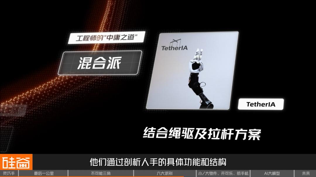 混合方案之前一直停留在学术研究领域,而 TetherIA 正在通过混合派路线,开发他们旗下的另外一款高自由度灵巧手方案。他们通过剖析人手的具体功能和结构 (结合绳驱及拉杆方案),将上面提过的绳驱、拉杆等方案有机结合在一起,通过强大的工程化实现能力,开发出了一款既高效又可靠的高自由度灵巧手方案。