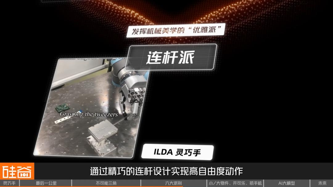 这一派的代表作是源自韩国研究团队提出的 ILDA 灵巧手,通过精巧的连杆设计实现高自由度动作。它的哲学是:将驱动器全部集成在手掌内部,用连杆、摇臂、滑块等机构把多个直线动作“ 分配” 到多个关节,让手指多个关节弯曲,摆出类似人类手指的各种姿态。
