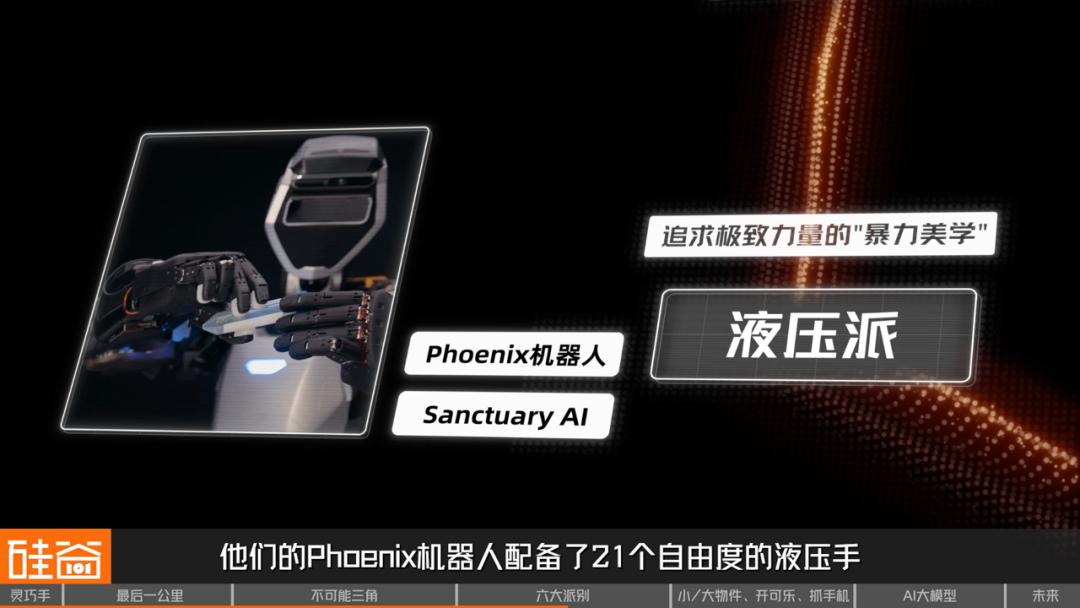 加拿大 Sanctuary AI 公司就走的液压驱动派系。他们的 Phoenix 机器人配备了 21 个自由度的液压手,能够产生强大的力量输出。