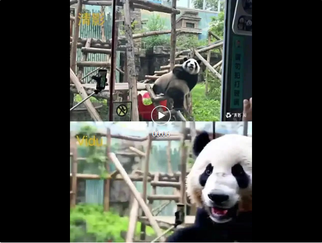 Vidu 这个视频就很尴尬了,除了首帧是原图外,之后视频出现的熊猫太突兀了,而且和原熊猫没有关系。