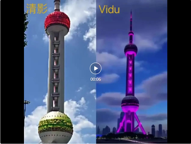 清影生成的视频没有显示完整的图片内容,聚焦在局部,这一点受到图生视频最初对竖版图片选择的影响。不过,这也带来东方明珠塔局部更清晰的视频效果,从下往上、依次亮、彩灯这几个元素都有很好展现。清影聚焦局部细节,且背景一致性更稳定,感觉就像东方明珠塔在眼前一点一点亮灯了,真实感更好。