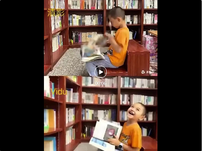 Vidu 生成视频中,小孩举起书翻动、仰头等动作,整体更连贯自然。