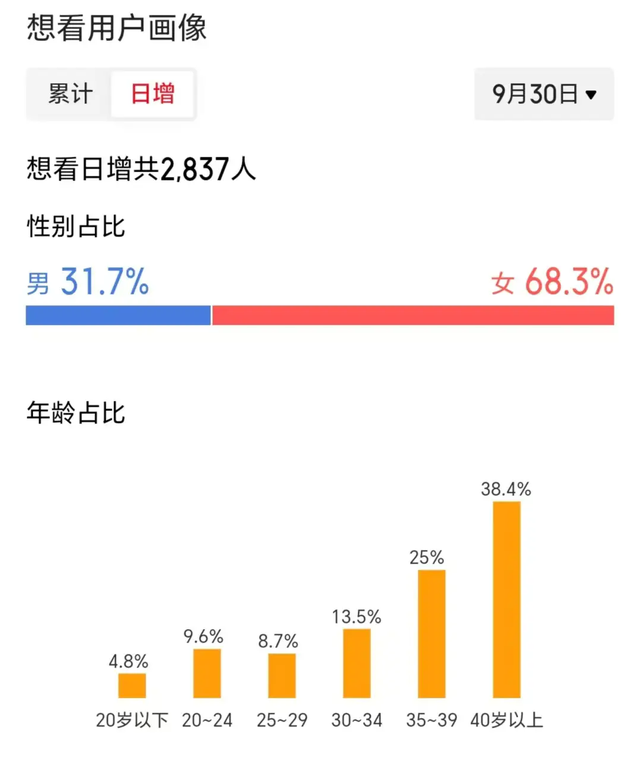 猫眼专业版显示,《志愿军 3》 的想看用户画像中,其 40 岁以上年龄层占比最高。同样受这一年龄段观众喜欢的还有 《三国的星空第一部》,其中女性占比逼近 70%。