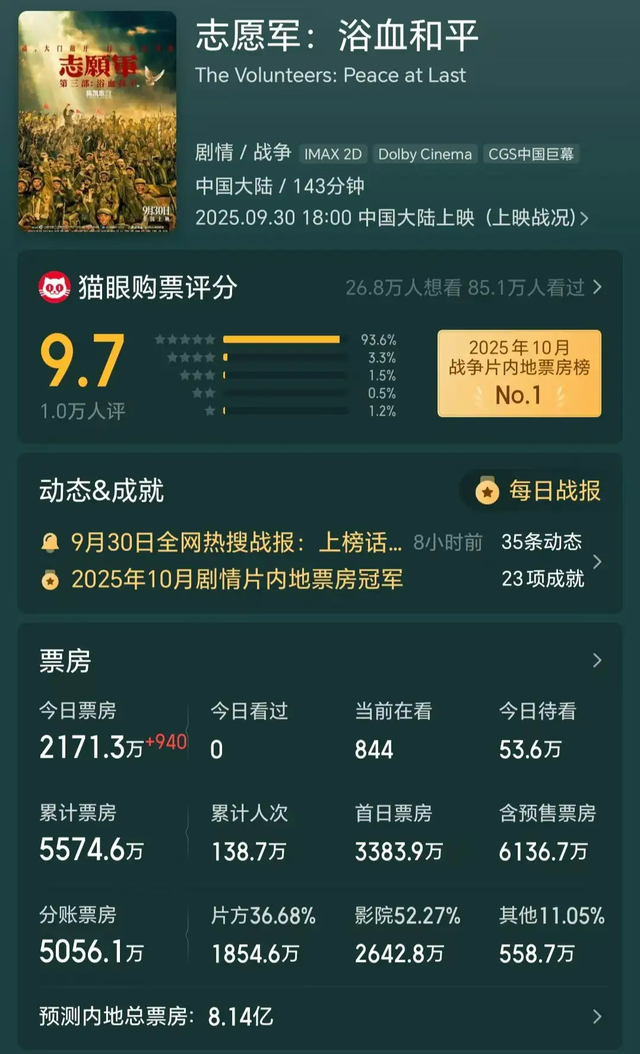 截至发稿前,猫眼专业版给 《志愿军 3》 的预测总票房为 8.14 亿,低于其前两部票房,对 《浪浪人生》 的预测仅为 3.81 亿。