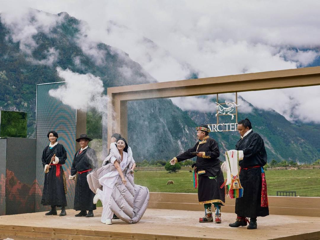 2023 年,始祖鸟“ 向上致美” 系列第一步就干到了云南香格里拉,首次将秀场搬到海拔 3300 米的高原山谷,以雪山、青稞架为天然背景,让登山家、藏族青年和专业模特同台,揭开首个始祖鸟与松赞联名产品“ 卡瓦格博” 系列的面纱。