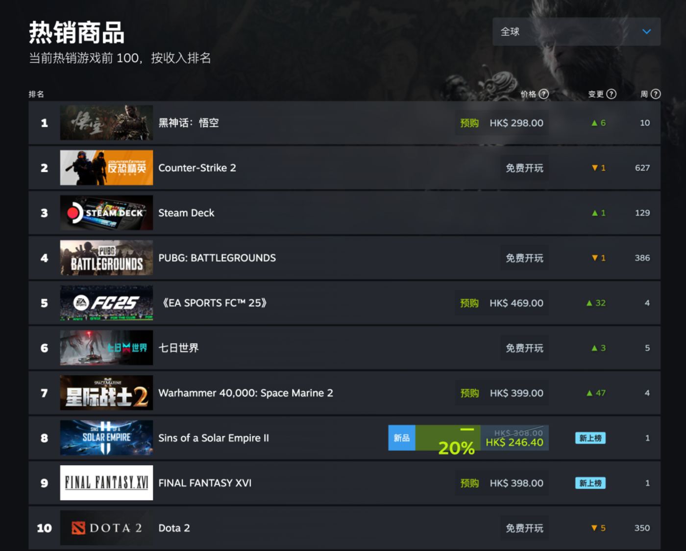 现在,《黑神话:悟空》 是 Steam 平台上的全球销量冠军,甚至与游戏本体一并发售的豪华版升级包,都挤进部分地区的销量榜单前十。