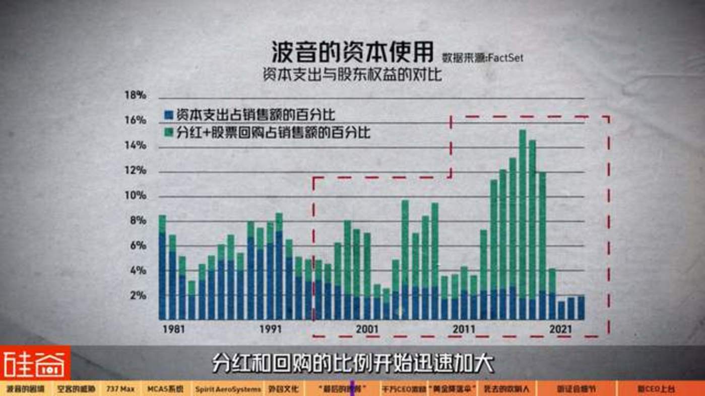 与此同时,这是波音从 80 年代以来,每年 「资本支出」 和 「股东分红及股票回购」 的金额对比。从 1996 年合并之后,分红和回购的比例开始迅速加大。