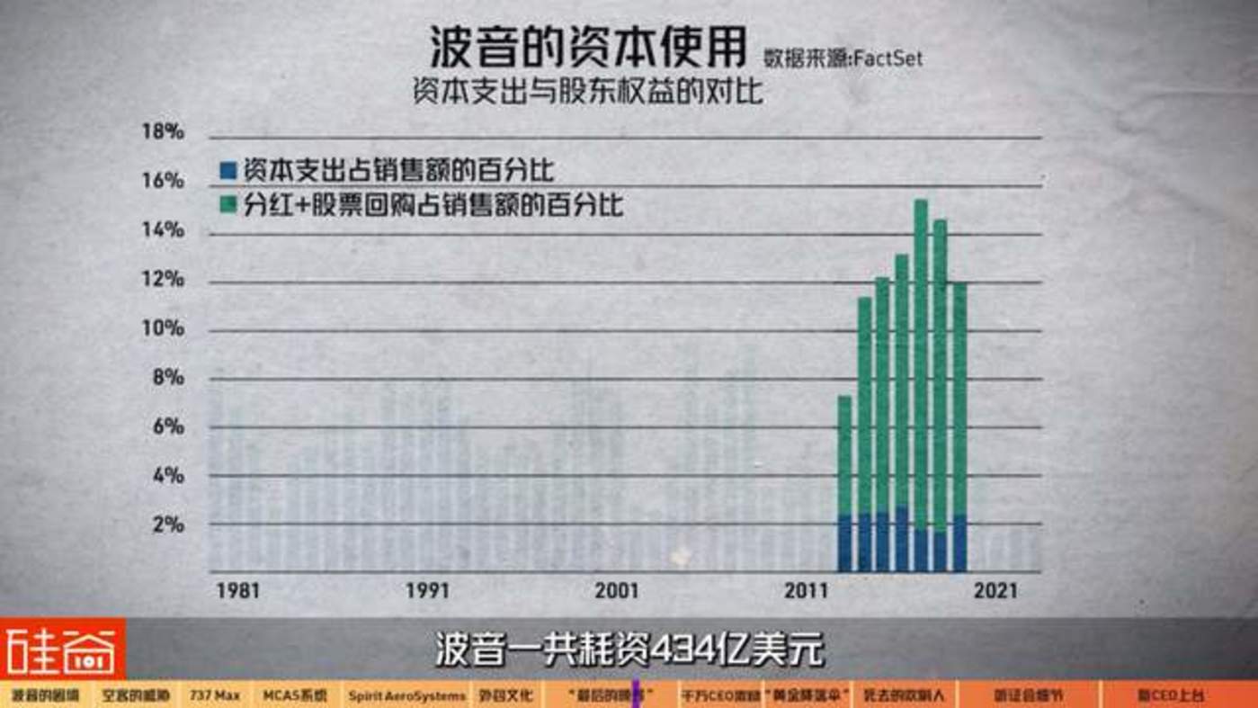 2013 年到 2019 年间,波音一共耗资 434 亿美元进行 23 次股票回购以抬高股价取悦华尔街和市场。就在 737MAX 第二起空难发生后的 2019 年 6 月,波音依然掏出 26.5 亿美元的现金进行股票回购。