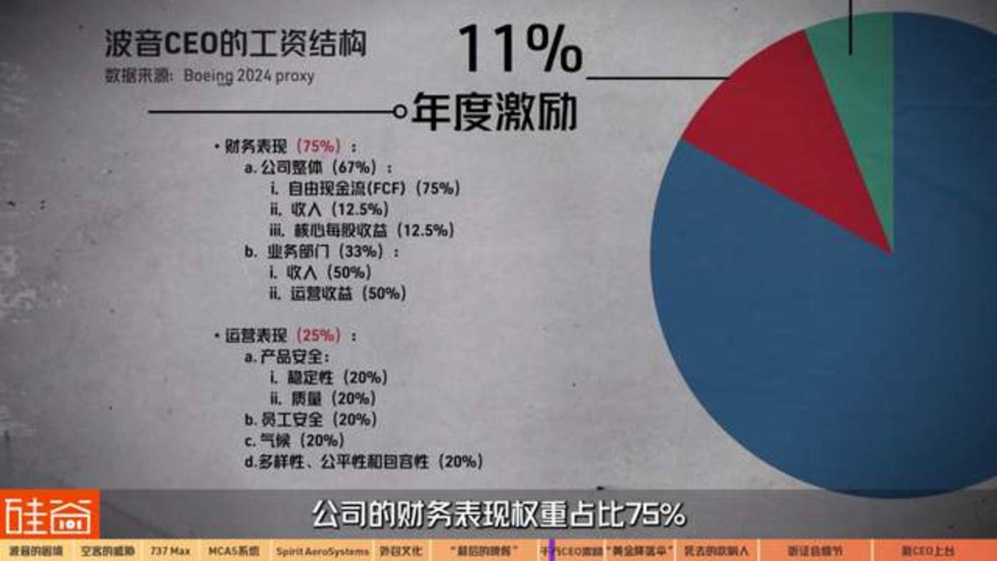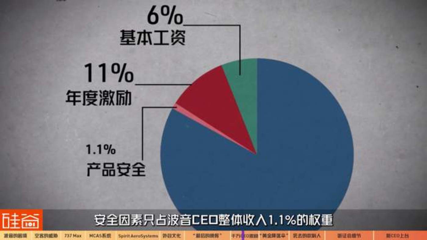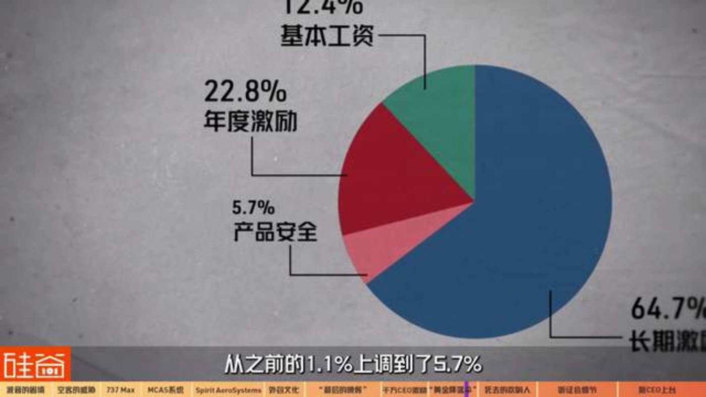 而作为对比,运营表现只占 CEO 年度奖金的 25% 权重,其中产品安全,包括稳定性和质量,加起来只占运营表现中 40% 的权重,也就是说,对于飞机制造商波音,产品安全对于 CEO 的年终奖影响只有 10%,安全因素只占波音 CEO 整体收入 1.1% 的权重。
