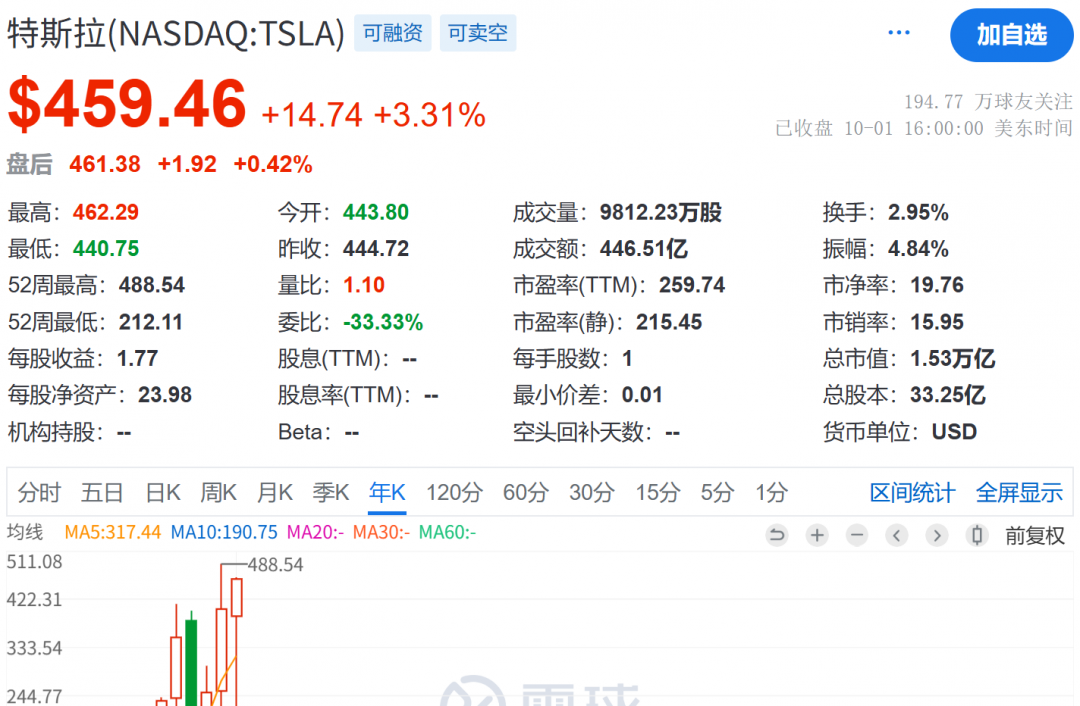 马斯克的财富与特斯拉紧密相连——截至 9 月 15 日他持有该公司逾 12.4% 的股份。今年以来特斯拉股价累计上涨约 14%。周三收盘,特斯拉股价上涨 3.3% 至 459.46 美元,总市值约 1.53 万亿美元。